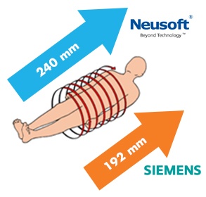 Detector coverage is the measure of how much anatomy the CT covers per rotation. The Scope 16 has a maximum detector coverage of 192mm while the NeuViz 16 covers 240mm. This means that the Scope has 25% less detector coverage and will need that much more time to cover the same anatomical region as the NeuViz.