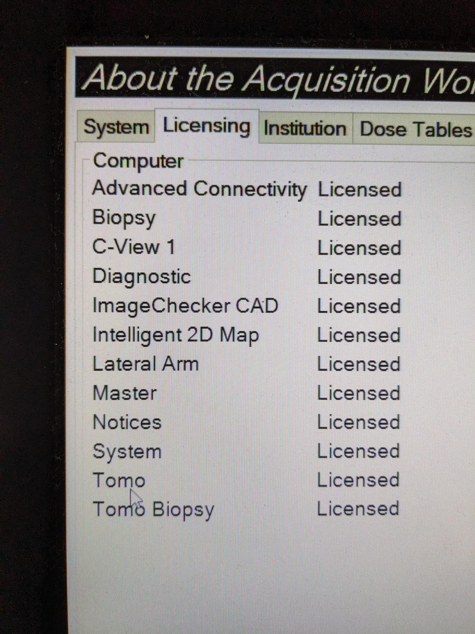 Licenses: Advanced Connectivity, Biopsy, C-View 1, Diagnostic ,Image Checker CAD, Intelligent 2D Map, Lateral Arm, Master, Notices, System, Tomo, Tomo Biopsy