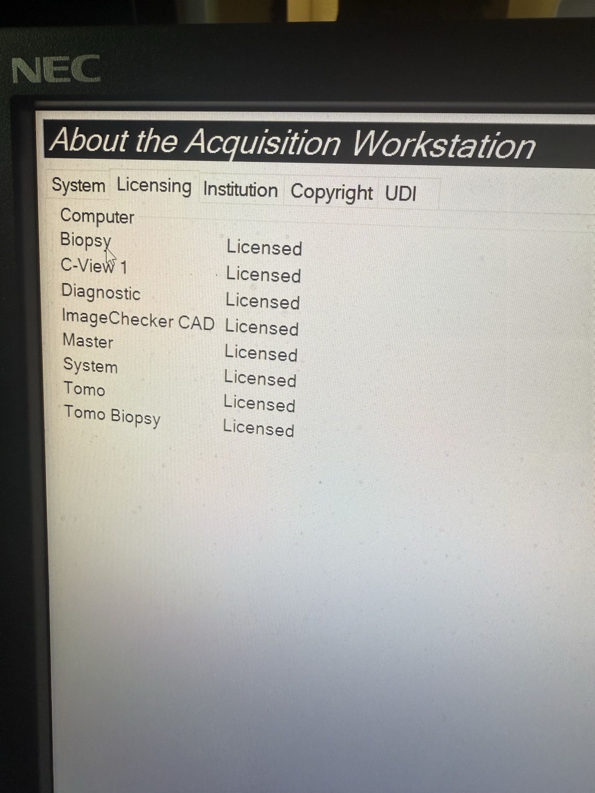 Licenses: Biopsy, C-View, Diagnostic, ImageChecker CAD, Master, System, Tomo, Tomo Biopsy