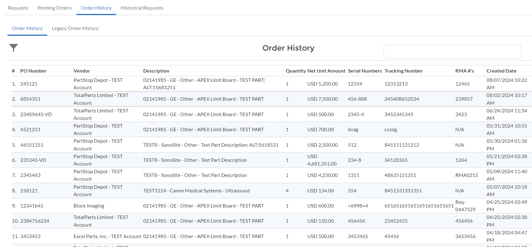 View your team's order history at a glance. Search by PN or PO# to view the purchase price, the vendor you bought from, the tracking number, and vendor RMA information.